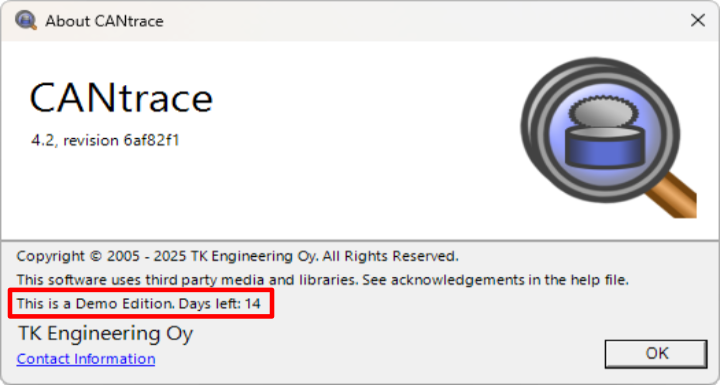 A Demo License is valid for 14 days from the start day. You can find out how many days you have left to use CANtrace by looking at the license information in the about box.