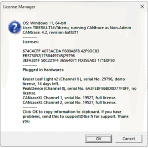 A license is needed to be able to use CANtrace. A license is always connected to a specific CAN hardware, but you can use any CAN hardware as long as a the hardware that is licensed is connected to the computer that runs CANtrace. For example, you can use both your Vector and Peak interfaces as long as the Kvaser Leaf Light which has CANtrace license is still plugged into your computer.